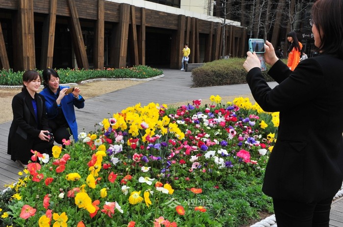 지난달 31일 서울 송파구청 앞 광장과 지역내 주요 가로변에 진행했던 봄꽃식재와 야생화 종자 씨뿌리기 사업으로 청사 앞 광장 테마화단이 봄단장을 마쳤다. 사진은 봄꽃이 가득 핀 구청앞 화단에서 삼삼오오 기념촬영을 하고 있는 주민들의 모습. (사진제공= 송파구청)