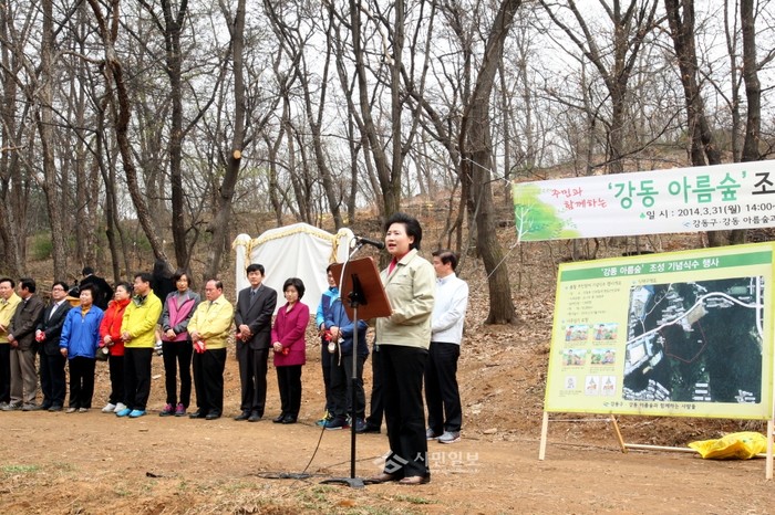 지난 3월31일 서울 강동구 상일동 명일공원에서 열린 ‘강동 아름숲 조성 시민기념식수’ 행사에 구관계자들과 지역주민들이 참석해 나무를 심었다. 사진은 이날 행사에 참여한 김정숙 구의회 의장이 주민들의 참여에 감사의 마음을 전하며 축사를 하고 있는 모습. (사진제공=강동구의회)