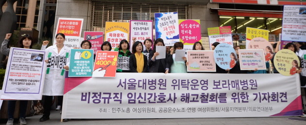 2일 오전 서울 중구 무교동 여성가족부 앞에서 민주노총 여성위원회 등 관계자들이 '서울대병원 위탁 운영 보라매병원 비정규직 임신 간호사 해고 철회와 복직을 위한 기자회견'을 하고 있다. 이들은 '여성가족부가 차별받는 여성문제를 해결하고 해고된 보라매병원 비정규직 간호사를 복직시킬 것'을 요구했다. 또한 '비정규직 여성노동자들이 임신 및 출산으로 인해 차별받는 사례를 적극적으로 조사해 차별을 근본적으로 해결할 수 있는 법과 제도를 만들 것'을 주장했다.