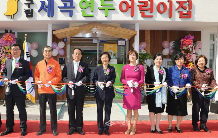 지난 1일 오후 서울 강남구 세곡동에서 구립 어린이집인 '세곡연두어린이집'의 개원식이 열렸다. 사진은 이날 어린이집 개원식에 참석한 신연희 구청장(왼쪽 4번째)과 관계자들이 테이프 커팅을 하고있는 모습.