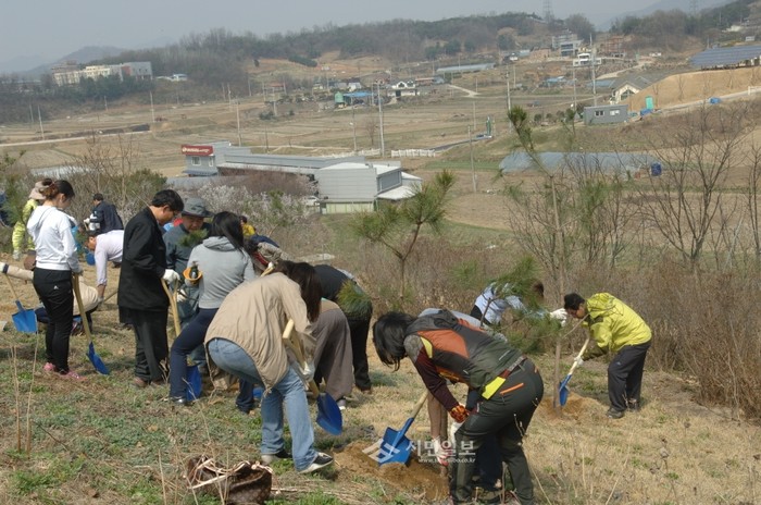 2일 경기 양평군은 제69회 식목일을 맞아 양평읍 공흥리 쌈지공원에서 (사)생명문화와 함께 생명을 존중하는 사회 '생명의 나무 가꾸기'행사에 참여해 지역주민 40여명과 함께 7년생 소나무 100그루를 심었다. 사진은 이날 행사에 참여한 주민들이 나무를 심는 모습. (사진제공=양평군청)