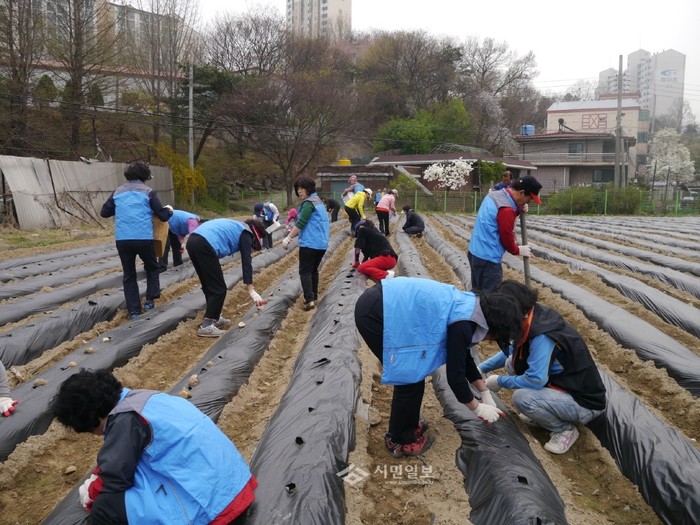 3일 경기 용인시 수지구 죽전1동 통장협의회는 죽전동 일대에서 '사랑의 감자심기'행사를 열었다. 이 날 심은 감자는 수확 후 판매 수익금 전액이 불우이웃돕기에 쓰이며 추후 같은 자리에 배추를 심어 지역내 경로당과 불우이웃을 돕는데 사용될 예정이다. 사진은 이날 감자를 심는 참여자들의 모습(사진제공=용인시청)