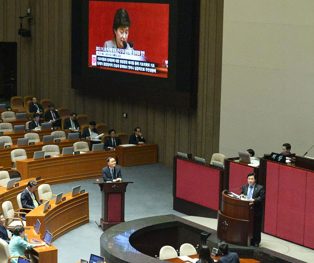 3일 오후 서울 여의도 국회에서 열린 323차 국회(임시회) 3차 본회의 정치에 관한 대정부 질문에서 새정치민주연합 이석현 의원이 정홍원 국무총리에게 질문 중 박근혜 대통령의 대선후보 당시 발언이 담긴 영상을 공개하고 있다.
