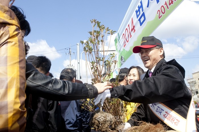 경북 구미시는 지난 4일 제69회 식목일을 맞아 숲과 나무의 소중함을 일깨우고 매실, 감나무, 산수유, 영산홍 등 유실수 및 화목류 8500여그루를 시민들에게 나누어 주는 ‘2014 범시민 나무 나누어 주기’ 행사를 구미버스터미널, 선산버스터미널 앞에서 개최했다. (사진제공=구미시청)