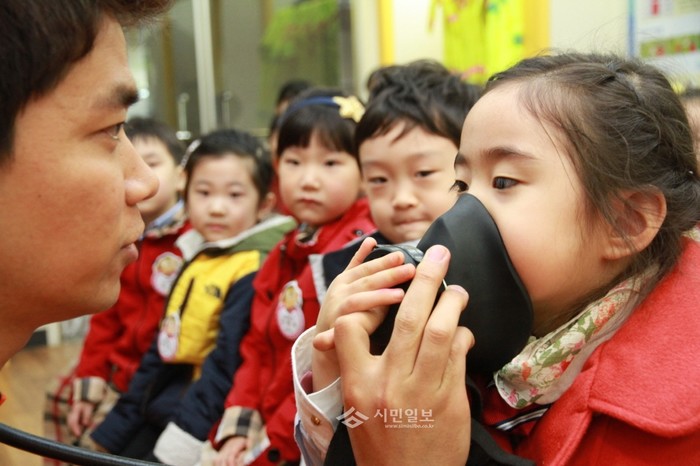 서울 구로소방서는 지난 4일 안전체험 프로그램의 일환으로 소방안전 체험교실에서 부천시 소사구에 위치한 '예일유치원' 원생 및 지도교사들과 함께 '1일 병아리 소방관' 체험학습을 실시했다. 사진은 이날 체험학습에 참여한 예일유치원 원생들이 산소호흡기를 직접 체험 중인 모습. (사진제공=구로소방서)