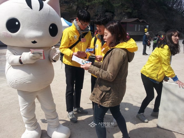 지난 5일 경기 고양시 덕양구는 오는 25일 열릴 '2014 고양 국제 꽃박람회'를 홍보하고 시민들에게 입장권 구입에 편의를 제공하기 위해 북한산에서 홍보활동과 티켓 판매를 실시했다. 사진은 고양시의 마스코트인 고양이가 시민들에게 홍보물을 나눠주는 모습.(사진제공=고양시청)