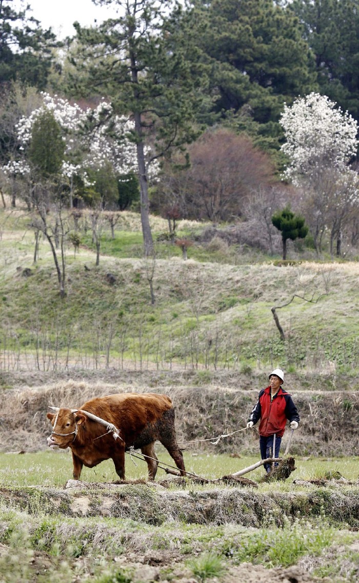 7일 오전 전남 강진군 군동면 관덕마을의 봄 들판에서 한 농부가 요즘은 보기 힘든 코뚜레 달고 있는 소를 몰아 쟁기질을 하고 있다. /사진=강진군 제공
