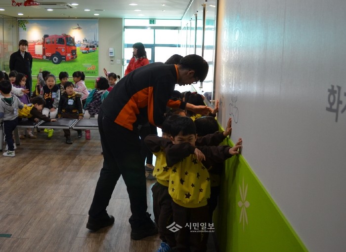 8일 인천남동소방서는 아이뜰어린이집 원생 30여명을 대상으로 119소방안전체험장에서 어린이들의 생활속 안전사고 및 화재예방을 위해 '소방안전체험교실'을 열었다. 사진은 이날 소방관으로 부터 열·연기 피난 체험교육을 받고 있는 원생들의 모습. (사진제공=인천남동소방서)