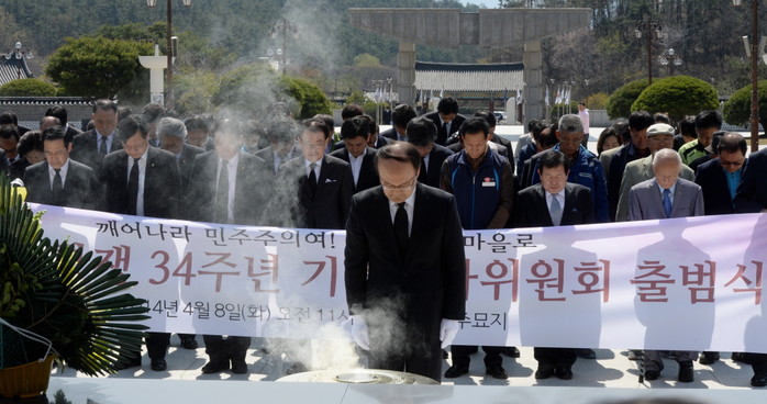 5.18민주항쟁 34주년 기념행사위원회가 8일 오전 광주 북구 운정동 국립 5.18민주묘지에서 출범식을 열었다. 오재일 상임위원장(5.18기념재단 이사장) 등이 오월영령 앞에 묵념을 하고 있다.