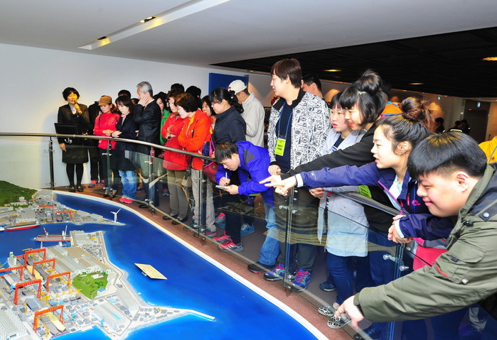 | ▲ 8일 현대중공업을 방문한 장애인들이 직원들의 안내를 받아 현대중공업 내부를 돌아보는 모습. | ||