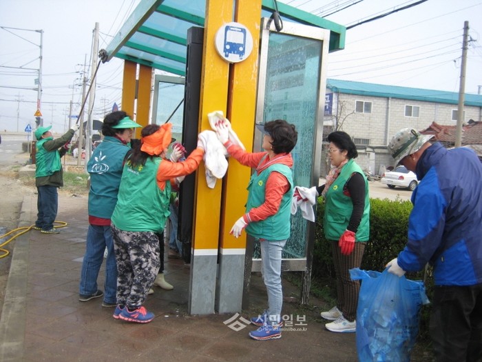 9일 경기 연천군 전곡읍이 '새봄맞이 청결주간'을 맞아 전곡읍 새마을협의회, 부녀회, 공무원 등 30여명이 참여해 지역내 17개 버스정류장의 지붕, 유리창을 청소하고 불법 광고물을 철거하는 등 환경정화 활동을 펼쳤다. 사진은 이날 활동 참여자들이 승강장을 청소하는 모습. (사진제공=연천군청)