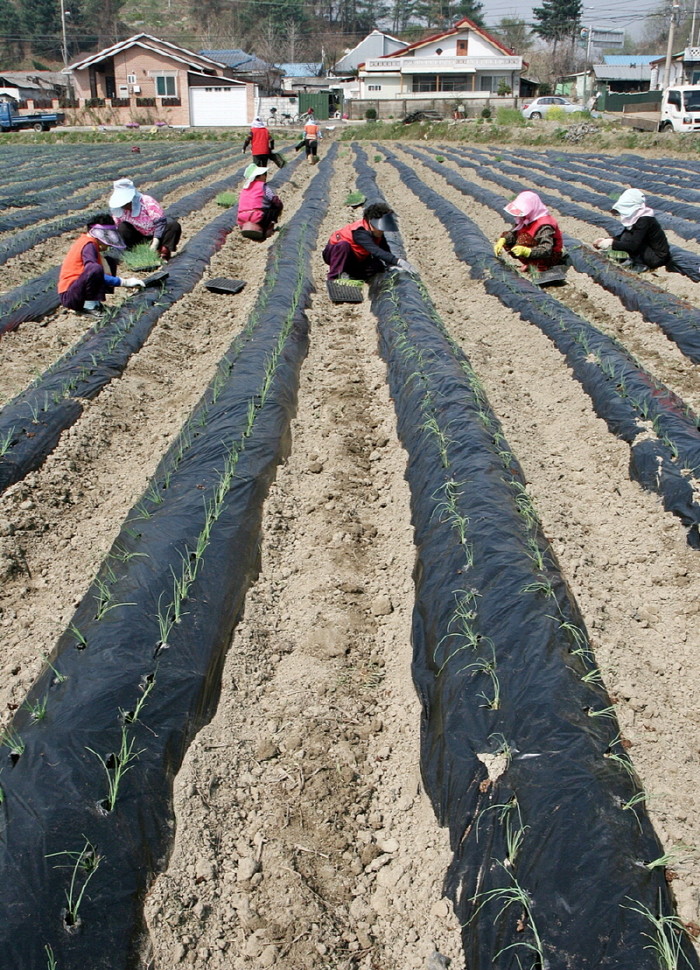 9일 충북 증평군 증평읍 미암1리 미륵마을 들녘에서 마을 아낙네들이 대파 모종을 심고 있다.