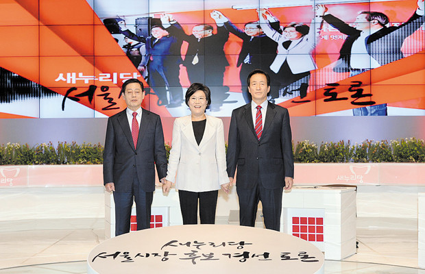 9일 오후 정몽준(오른쪽부터), 이혜훈, 김황식 새누리당 서울시장 예비후보가 TV경선토론을 위해 서울 여의도 MBC 스튜디오에서 손을 잡고 포즈를 취하고 있다.
