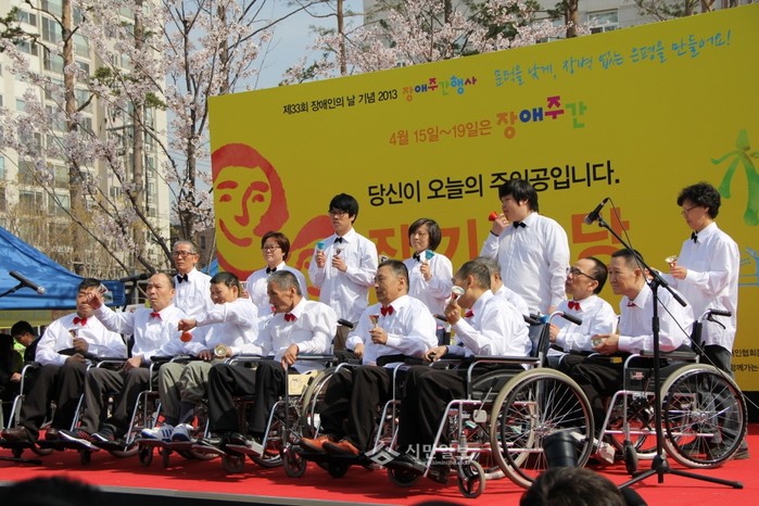 | ▲ 지난해 열린 제33회 장애인의 날 기념행사에서 휠체어를 탄 장애인들이 종소리 연주회를 펼치고 있다. (사진제공=은평구청) | ||