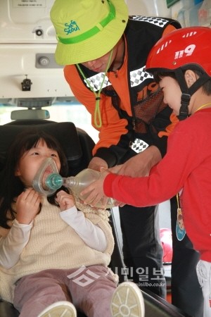 서울 구로소방서는 지난 11일 영서초등학교 운동장에서 영서초등학교 병설유치원 원생 및 교사들을 대상으로 아동안전체험차량을 활용한 현장체험학습 프로그램 ‘보고, 느끼고, 체험하는 119 안전교실’을 실시했다. 사진은 구급차 탑승체험 중인 아이의 모습. (사진제공=구로소방서)
