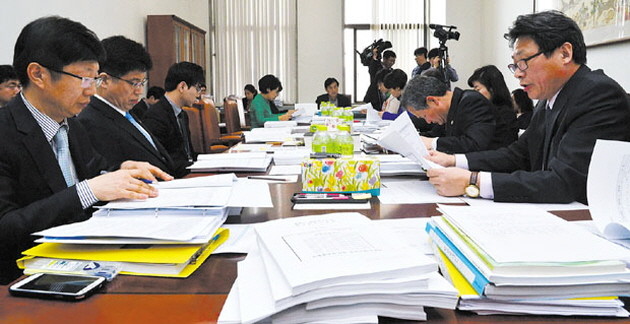 14일 오전 서울 여의도 국회에서 유재중 소위원장 주재로 열린 보건복지위원회 법안심사소위원회에서 의원 및 참석자들이 자료를 살펴보고 있다. 이날 열린 법안심사소위에서 의원들은 기초노령연금법 일부개정법률안 등 56개 법안을 심사할 예정이다.