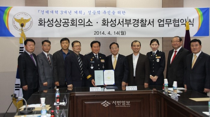 경기 화성서부경찰서는 지난 14일 화성상공회의소 3층에서 경제개혁 3개년 계획의 성공적인 추진을 위해 교통정리·신호체계 개선을 통한 기업의 물류 수송 편의도모 등 기업활성화 방안을 내용으로 하는 업무협약을 화성상공회의소와 체결했다. 사진은 협약체결 후 기념촬영 중인 협약식 관계자들의 모습. (사진제공=화성서부 경찰서)