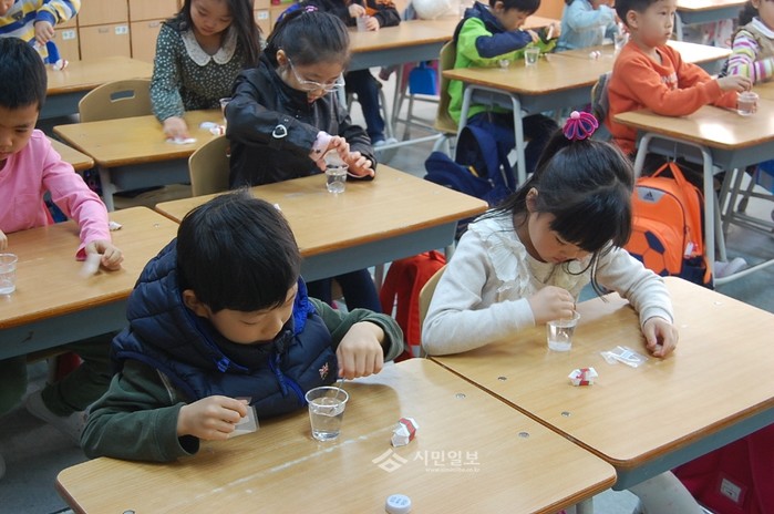 지난 15일 부천 상동초등학교가 4월 셋째·넷째주를 과학주간으로 정해 항공우주 에어로켓 발사하기 등 전교생을 대상으로 하는 각종 과학탐구대회를 개최했다. 사진은 이날 과학탐구대회에 참여한 학생들이 실험에 집중하고 있는 모습.(사진제공=부천교육지원청)