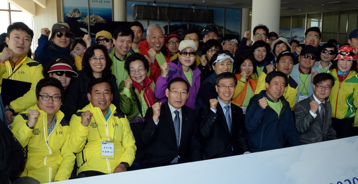 16일 오후 경상북도 울릉도 사동항에서 조종철(앞줄 왼쪽부터) 독도사랑 운동본부 사무차장, 이상배 자문위원, 손강목 울릉농협 조합장, 강철구 울릉군 부군수, 윤기석 NH농협생명 본부장, 현정도 NH농협은행 울릉군 지점장이 NH농협생명 임직원들과 함께 독도 수호를 위한 화이팅을 외치고 있다.