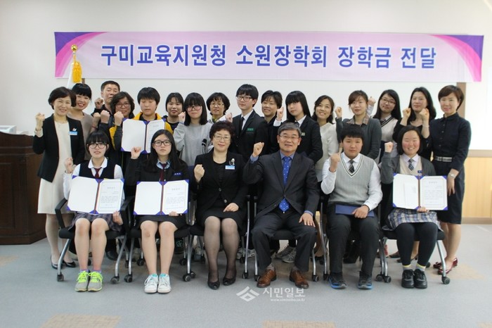 경북 구미교육지원청은 지난 15일 학업성적이 우수하고 품행이 단정한 9명의 학생에게 장학금 50만원과 장학증서를 전달했다. 소원장학회는 지역내 독지가 부부가 아들의 못다 이룬 꿈을 아쉬워하며 또래 중학생들이 어려운 환경에서도 노력해 꿈을 이루기 바라는 뜻에서 2007년부터 1억5000만원을 기탁해 그 이자로 운영되고 있다. (사진제공=구미교육지원청)