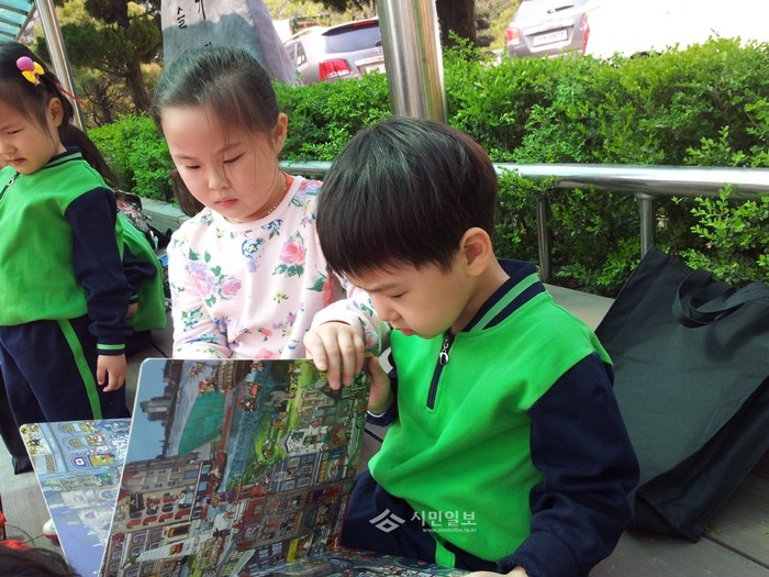 최근 경기 부천 상원초등학교병설유치원 만5세반 유아와 만 4세반 유아가 한 명씩 짝을 이뤄 유아의 '마음 씨앗 키우기 활동'의 일환으로 바깥놀이 및 산책 활동을 했다. 사진은 유치원 주변 공원에서 독서활동에 집중하고 있는 아이들의 모습. (사진제공=부천교육지원청)