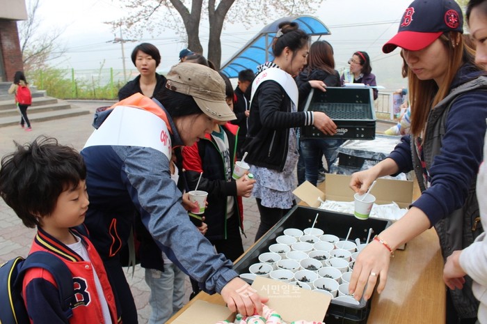 지난 16일 충남 아산교육지원청은 지역내 금곡초등학교 앞에서 '푸른나래 학부모회'와 함께 주먹밥 400여개를 등교하는 학생들에게 나눠주는 '아침밥이 보약' 캠페인을 실시하고 아침밥 먹기의 중요성을 홍보했다. 사진은 이날 학부모들이 어린이들에게 주먹밥을 나눠주는 모습. (사진제공=아산교육지원청)