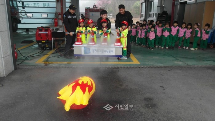지난 16일 경기 포천소방서 소흘119안전센터는 지역내 어린이집 원생과 교사 70여명을 대상으로 소방서 견학과 어린이들에 눈높이에 맞춰 119신고·화재대피요령 등을 포함하는 소방안전교육을 했다. 사진은 이날 참여한 어린이들이 물 소화기를 체험 중인 모습. (사진제공=포천소방서)
