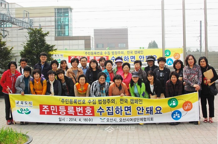 지난 16일 경기 오산시가 오산역 일대에서 개인정보 보호에 대한 국민적 관심을 높이고 오는 8월부터 시행될 개인정보 보호법과 관련한 내용을 지역 주민들에게 홍보하는 '주민등록 수집 법정주의 전국 동시 캠페인'을 실시했다. 사진은 이날 참여자들이 활동을 마치고 기념촬영을 한 모습. (사진제공=오산시청)