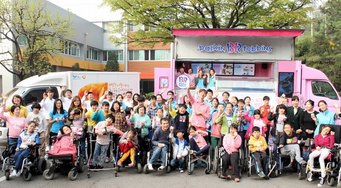 | ▲ 지난 16일 경기 성남시의 소망재활원에서 원생들과 SPC그룹 임직원들이 ‘행복한 빵 나눔차’와 ‘배스킨라빈스 핑크카'앞에서 기념사진 촬영을 하고 있다 | ||