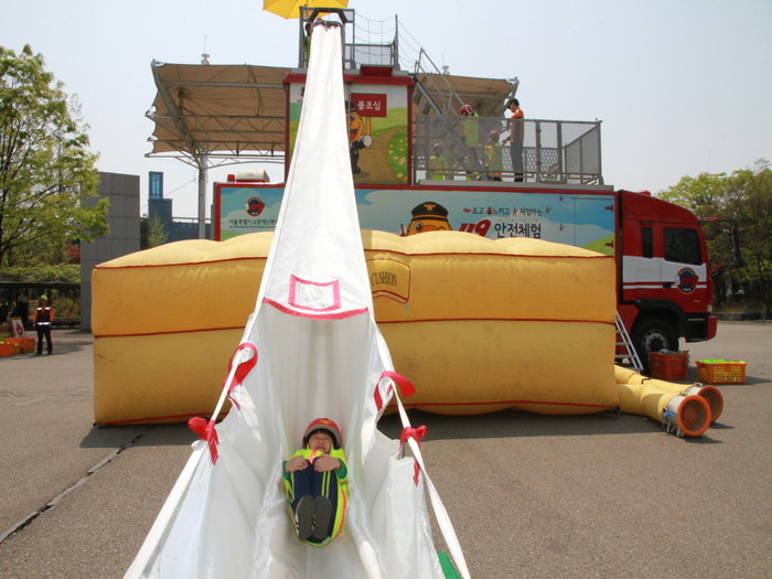 지난 18일 서울 구로소방서가 능곡어린이집 원생 및 교사 등을 고척 근린공원으로 초청해 이동안전체험차량을 활용한 '보고 느끼고 체험하는 119 안전교실' 현장학습을 실시했다. 사진은 이날 교육에 참여한 어린이들이 소방관 복장을 착용하고 대피체험을 하고있는 모습.(사진제공=구로소방서)