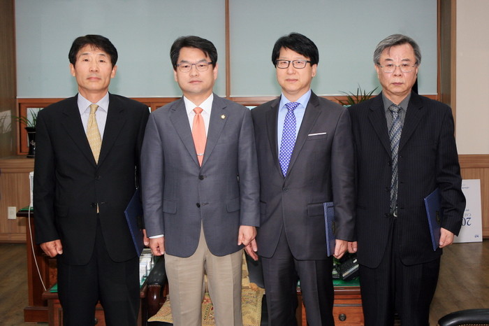 서울 중구의회는 지난 17일 구의회 의상실에서 '2013 회계연도 세입·세출 결산검사 위원' 위촉식을 열고 조영훈 의원을 책임검사 위원으로, 최원익 회계사, 이동훈 세무사, 이재희 (전)공무원 등 전문가 4명을 위원으로 위촉했다. 사진은 위촉식 후 기념촬영을 하는 모습. (사진제공=중구의회)