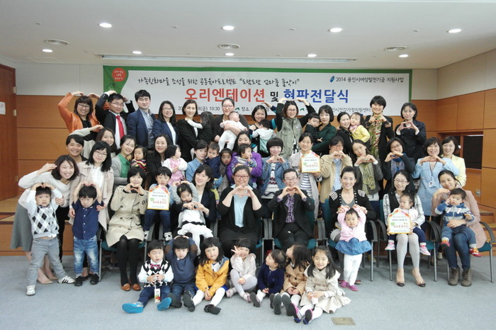 경기 용인시와 용인시건강가정지원센터는 지난 18일 가족친화마을 조성을 위한 공동육아 프로젝트 '도담도담 엄마품 품앗이' 사업을 위해 4개 품앗이팀을 선정, 시청 철쭉실에서 공동육아 시범마을 현판을 전달했다. 이번 프로젝트 참여팀은 수지오룡, 더빛키즈, 꾸러기친구들, 엄마사랑 놀이학교 등 총 4팀이며, 올 한해 서로 품을 나누면서 자녀를 함께 키우는 품앗이활동을 적극 펼칠 예정이다. (사진제공=용인시청)