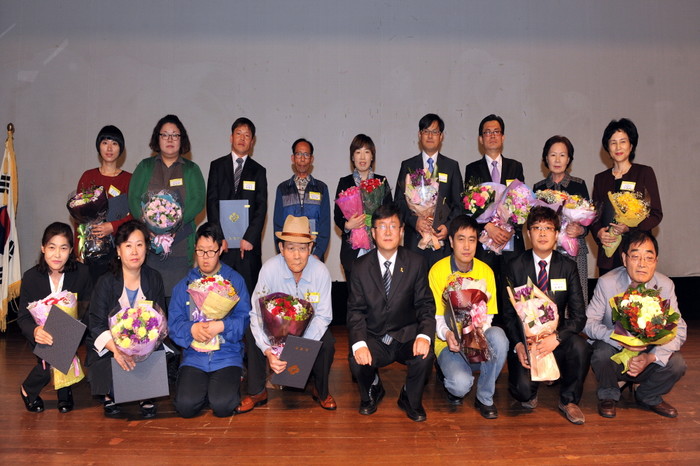 지난 18일 오전 서울 노원구가 구민회관에서 '제34회 장애인의 날 기념식'을 열었다. 사진은 이날 행사에 참여한 구 관계자들과 투철한 봉사정신으로 장애인 복지 증진에 노력한 유공자들이 함께 기념촬영을 하는 모습. (사진제공=노원구청)