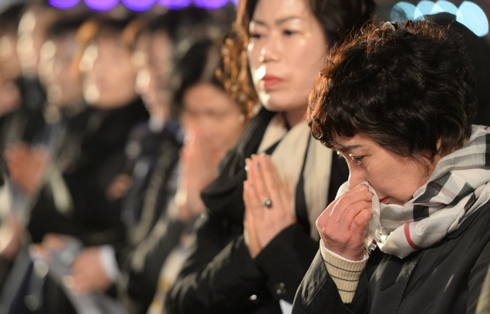 19일 오후 대구시 남구 신천 중동교에서 대구불교총연합회 주최로 ‘세월호 실종자 무사귀환을 기원하는 합동대법회’가 열린 가운데 한 신도가 눈물을 흘리고 있다.