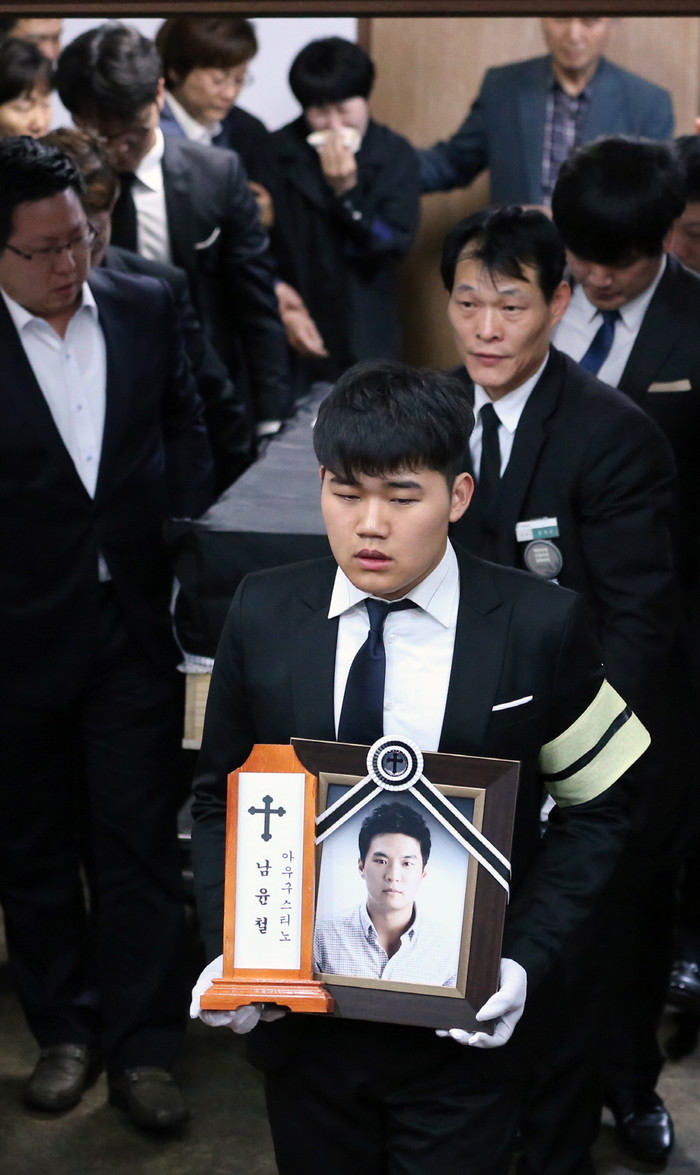 침몰 여객선 세월호에서 학생들을 대피시키다 목숨을 잃은 안산 단원고 고 남윤철 교사의 장례식이 엄수된 20일 오전 경기도 안산 제일장례식장에서 유가족과 지인들이 운구행렬을 따르고 있다.