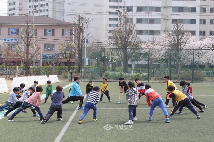 경기 동두천시 사동초등학교는 최근 3~4학년 학생 등을 대상으로 학교 운동장에서 축구동아리 활동을 시작했다. 이날 동아리 활동에서는 드리블, 슈팅, 패스, 트래핑 등의 기술연습과 연습게임이 진행됐다. 사진은 본격적인 동아리 활동에 앞서 스트레칭 중인 학생들의 모습. (사진제공=동두천시청)