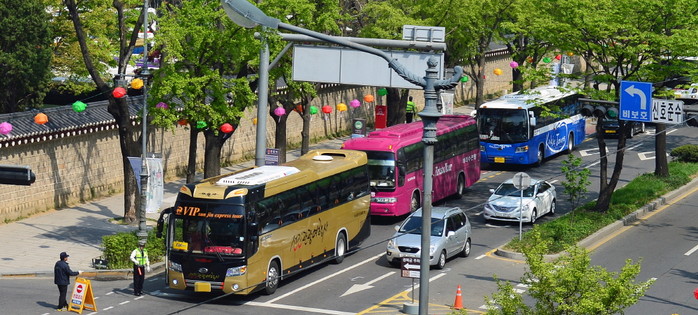 21일 오전 서울 종로구 세종로 경복궁 주차장 입구에서 주차안내원과 교통경찰이 만차된 주차장 상황을 알리며 관광버스를 인근 주차장으로 분산주차 유도 하고 있다. 서울시는 21일부터 오는 6월20일까지 경복궁, 명동, 동대문 디자인 플라자 일대를 중심으로 교통난을 가중시키는 관광버스를 도심내 주차공간으로 분산시킬 계획이라고 밝혔다.