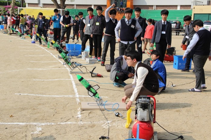 최근 충남 아산교육지원청이 과학인재를 육성하고 학생들의 과학선호도와 창의성, 탐구력을 높이기 위해 '2014 아산시 청소년 과학탐구대회'를 열어 4개 종목에 174팀 348명이 참여해 그동안 서로가 갈고닦은 역량을 겨루는 시간을 보냈다. 사진은 참여자들이 물로켓 경연에 참여 중인 모습.(사진제공=아산교육지원청)