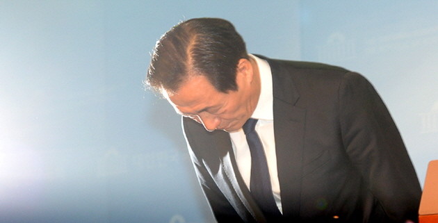 21일 오전 정몽준 새누리당 서울시장 예비후보가 서울 여의도 국회 정론관에서 자신의 막내 아들이 세월호 침몰과 관련해 페이스북에 국민정서가 미개하다고 글을 올린 것에 대해 대국민사과 기자회견 전 고개숙여 사죄하고 있다.