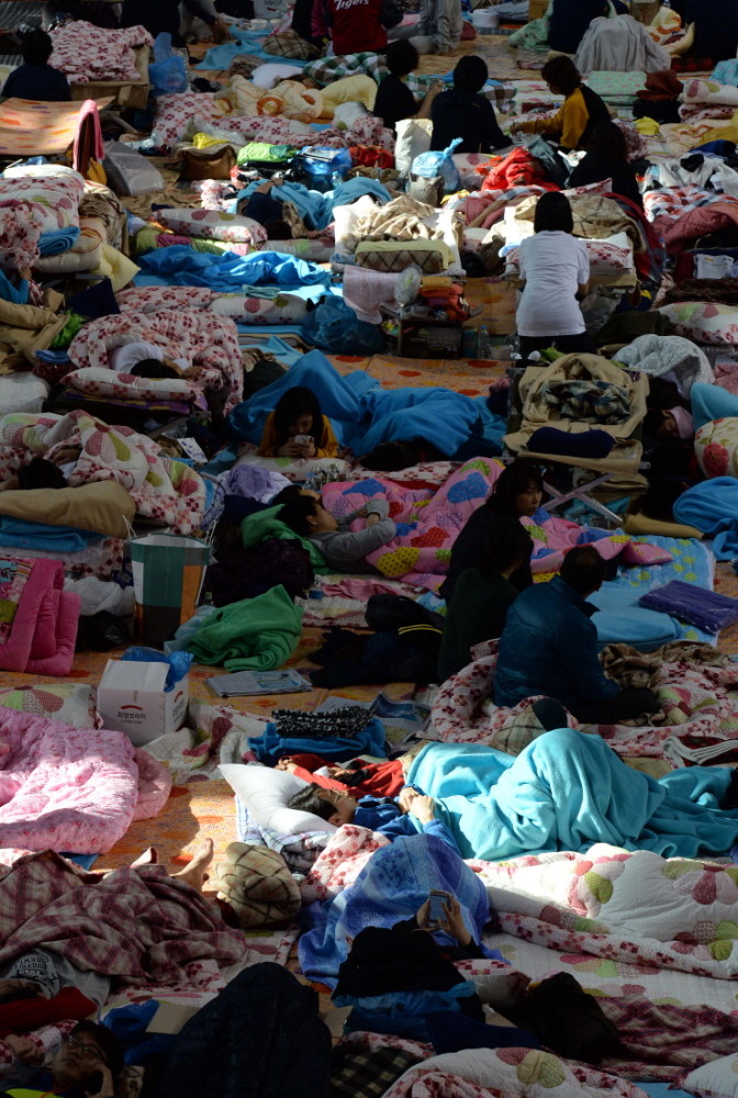 22일 오전 '세월호' 여객선 침몰 사고 실종자 가족들이 모여 있는 전남 진도 실내체육관에서 밤을 뜬눈으로 지새운 실종자 가족들이 새로운 소식을 기다리고 있다.