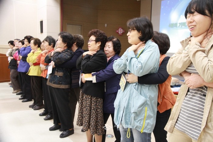 서울 구로소방서는 23일, 늘푸른시니어아케데미 지하1층 교육장에서 자원봉사자 및 노인 등을 대상으로 심폐소생술 등 응급처치 실습교육을 실시했다. 이날 하임리히법, 심정지·뇌졸중 등의 응급상황 발생시 주변사람들이 신속하게 대처할 수 있는 교육을 실시했다. 사진은 노인들의 하임리히법을 실습하고 있는 모습이다. (사진제공=구로소방서)