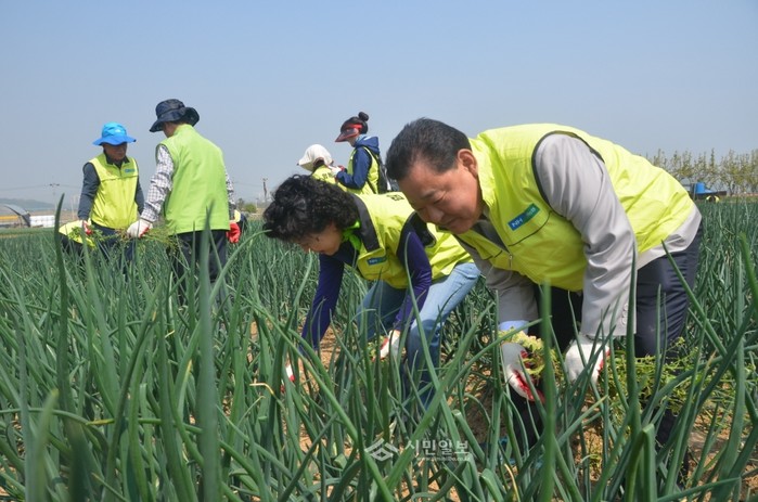 지난 21일 농협중앙회 경기지역본부와 고향주부모임 경기도지회가 경기 안성시 미양농협 대회의실에서 '제14기 경기농산물지킴이사업 발대식'을 개최하고 실무교육을 마친 후, 미양면 일대 농가에서 양파밭 잡초제거 일손 돕기를 실시했다. 사진은 일손돕기를 하는 지킴이들의 모습. (사진제공=경기농협)