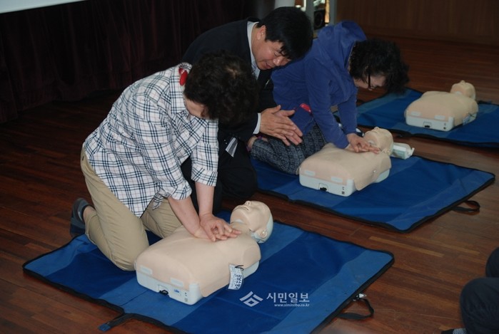 23일 서울 강남소방서가 대청 종합사회복지관에서 거동불편 홀몸노인 등을 보살피는 노인돌봄이 50여명을 대상으로 심폐소생술 교육을 실시했다. 사진은 노인돌봄이들이 소방서 관계자의 안내에 따라 심폐소생술 방법을 마네킹에 실습해보고 있는 모습. (사진제공=강남소방서)