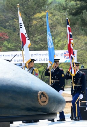 23일 오전 파주시 적성면 구읍리 설마리 전투비 인근에서 열린 '영국 참전비 제막식 및 임진강 전투 제63주년 기념식'에서 기수단이 태극기, 유엔기, 영국기를 들고 입장하고 있다. 임진강 전투는 영국군 제29여단이 1951년 4월 22~25일 설마리에서 중공군 공세에 맞서서 임진강을 사수한 전투다.