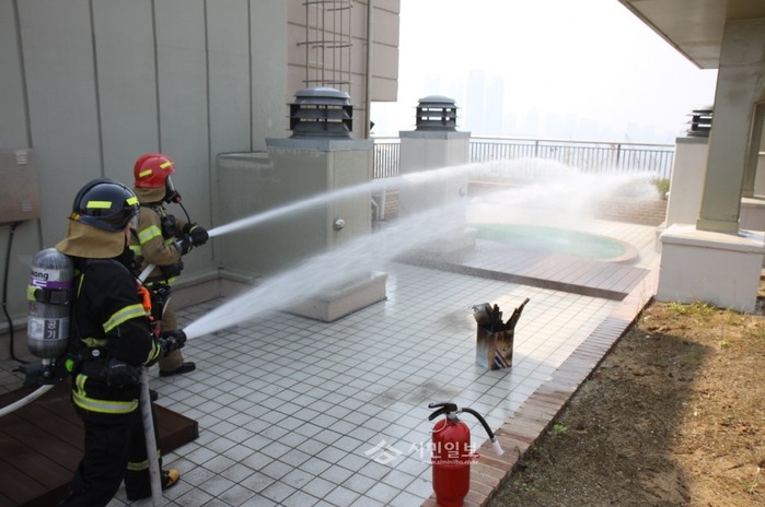 지난 23일 인천공단소방서가 자위소방대와 송도119안전센터 등과 함께 연수구 송도동에 위치한 롯데캐슬 33층에서 초고층 건축물 대상 합동소방훈련을 실시했다. 사진은 이날 훈련에 참가한 관계자들이 훈련에 앞서 사전 교육을 받고 있는 모습. (사진제공=인천소방서)