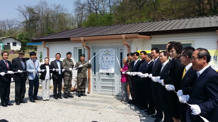 지난 23일 경기 포천시가 5군단과 함께 공공근로사업의 일환으로 기초생활수급자, 장애인 등 저소득층 취약계층 가정을 대상으로 지붕 수리, 도배 등을 무상으로 제공해 주거환경을 개선하는 '사랑의 보금자리 만들기 사업'의 준공식을 열었다. 사진은 준공식에 참여한 관계자들이 제막식을 하는 모습. (사진제공=포천시청)