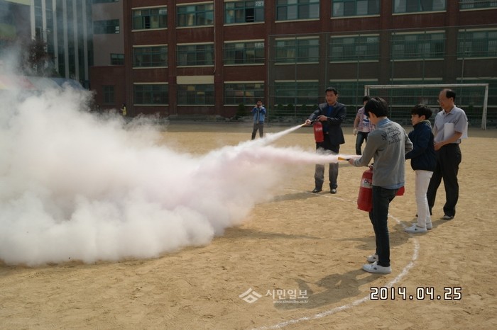경기 부천시 고강초등학교는 지난 25일 학교 건물과 운동장에서 전체 학생과 교직원 1000여명을 대상으로 부천소방서 원종 119안전센터와 합동으로 재난 대응 소방 훈련을 실시했다. 2시간 동안 진행한 이날 훈련에서는 실제 대피훈련을 포함해 소화기를 이용한 화재 진압까지 이뤄졌다. 사진은 소화기를 이용해 화재 진압을 하는 학생들의 모습. (사진제공=부천교육지원청)