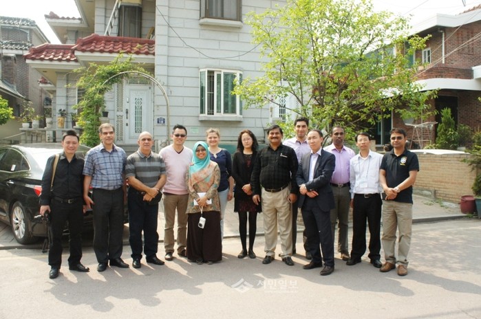 지난 25일 서울 강동구가 주택담장을 허물어 사유지 여유 공간에 주차할 수 있도록 하고 안전한 보행로를 확보하기 위해 시행하고 있는 '그린파킹 사업'의 벤치마킹을 위해 외국도시 공무원 연수단이 방문했다. 사진은 현장을 방문한 연수단이 기념촬영을 하고 있는 모습. (사진제공=강동구청)