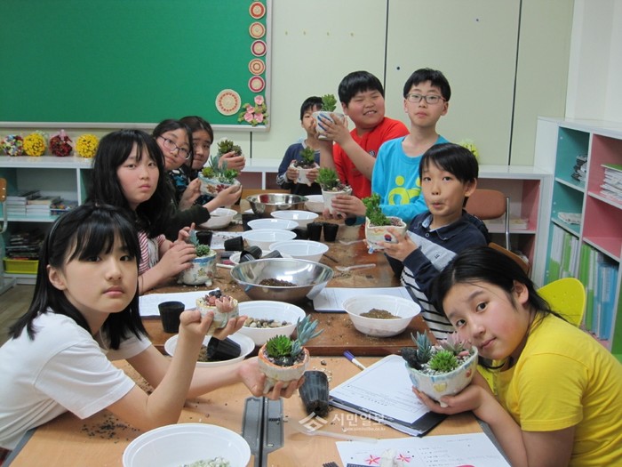 최근 인천 하점초등학교가 '예술 꽃 씨앗학교' 사업의 일환으로 전교생이 일상생활 속에서 친근하게 원예활동을 영위할 수 있도록 전문강사를 통한 원예활동 프로그램을 진행했다. 사진은 학생들이 도자기 시간에 직접 만든 화분에 다육식물을 심은 뒤 기념촬영을 하는 모습. (사진제공=강화교육청)