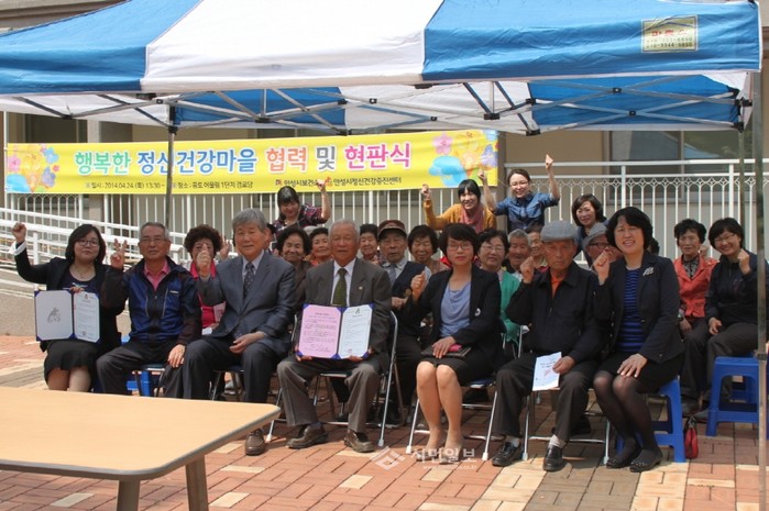 경기 안성시 보건소는 지난 24일 공도읍 어울림 아파트 경로당에서 주민 30여명이 참여한 가운데 '생명사랑 행복마을 현판식'을 열었다. '생명사랑 행복마을'은 대덕면 토현리, 소현리에 이어 공도읍이 3번째로 지정됐으며 3년째 운영되고 있다. 지정된 마을에는 월 1회 생명사랑 교육, 건강측정, 우울증 및 치매 예방, 건강체조 등 다양한 프로그램이 제공된다. (사진제공=안성시청)